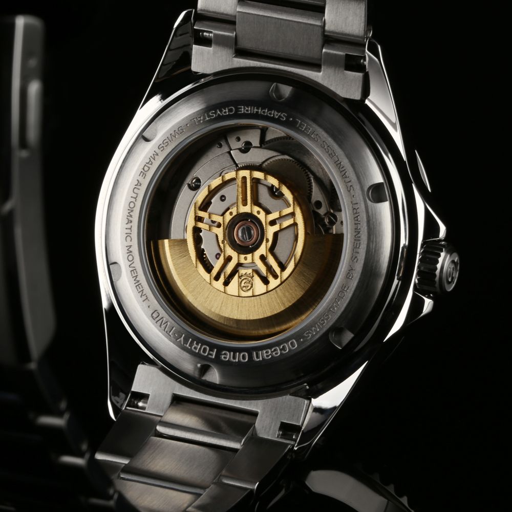 Das tiefschwarz lackierte Zifferblatt setzt einen markanten, edlen Akzent und sorgt für eine klare, kontrastreiche Ablesbarkeit unter allen Lichtverhältnissen. Erzgänzt wird das hochwertige Erscheinungsbild durch einen Saphirglasboden, der den Blick auf das Uhrwerk freigibt. Der goldfarbene Rotor mit STEINHART Logo verleiht dem mechanischen Innenleben eine exklusive Note.