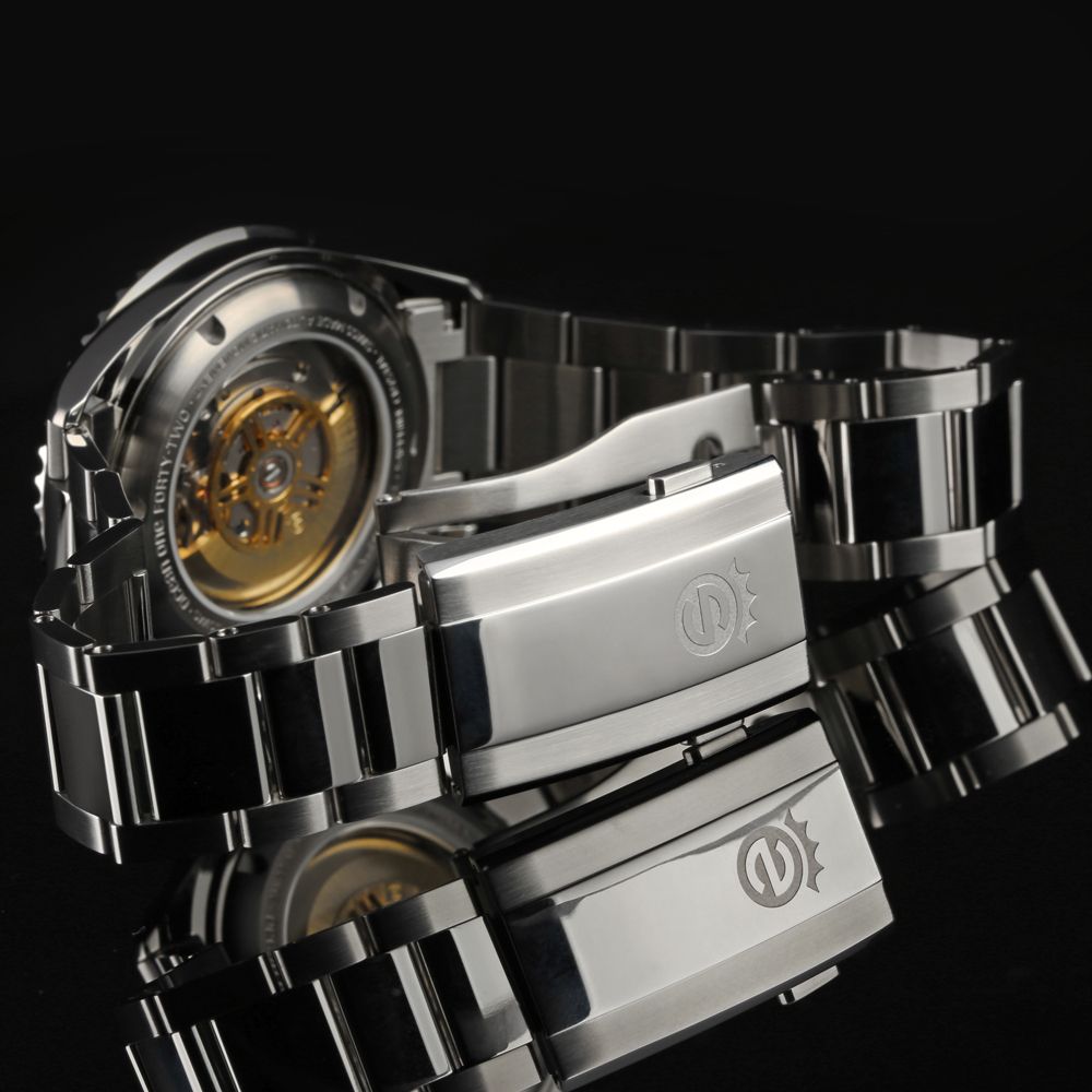 Das hochwertige dreigliedrige Edelstahlarmband mit polierten Mittelgliedern setzt stilvolle Akzente und verleiht der Uhr eine edle, sportliche Ausstrahlung. Für maximale Flexibilität verfügt das Band über eine Taucherverlängerung sowie eine neu entwickelte Faltschließe mit Schnelljustierung, die eine perfekte Anpassung an das Handgelenk ermöglicht – selbst unter anspruchsvollen Bedingungen.