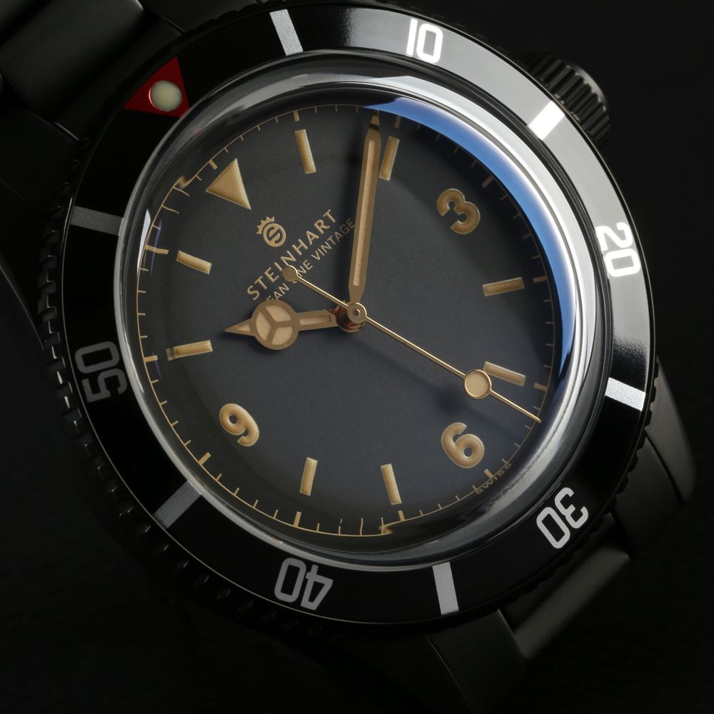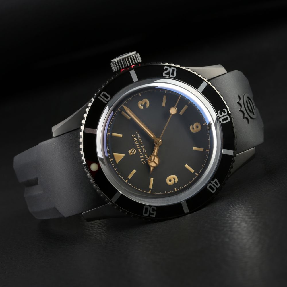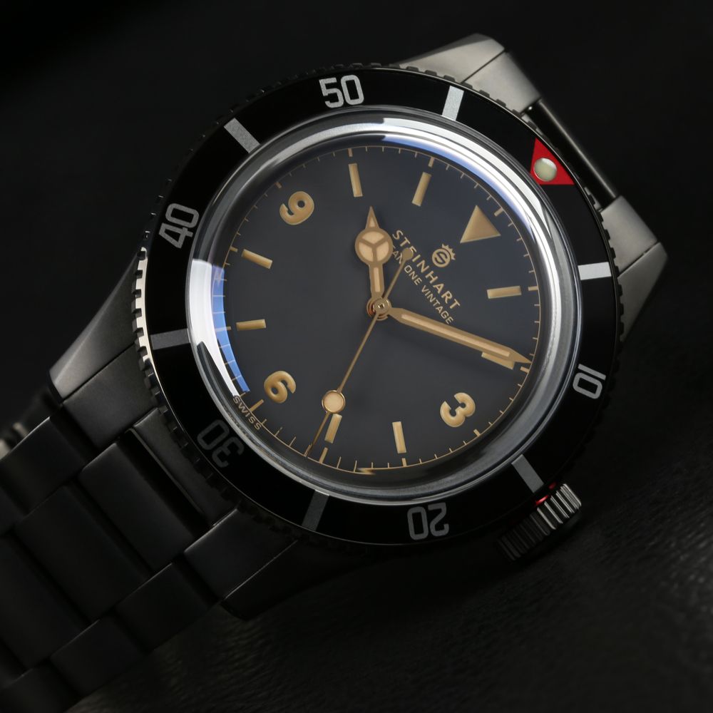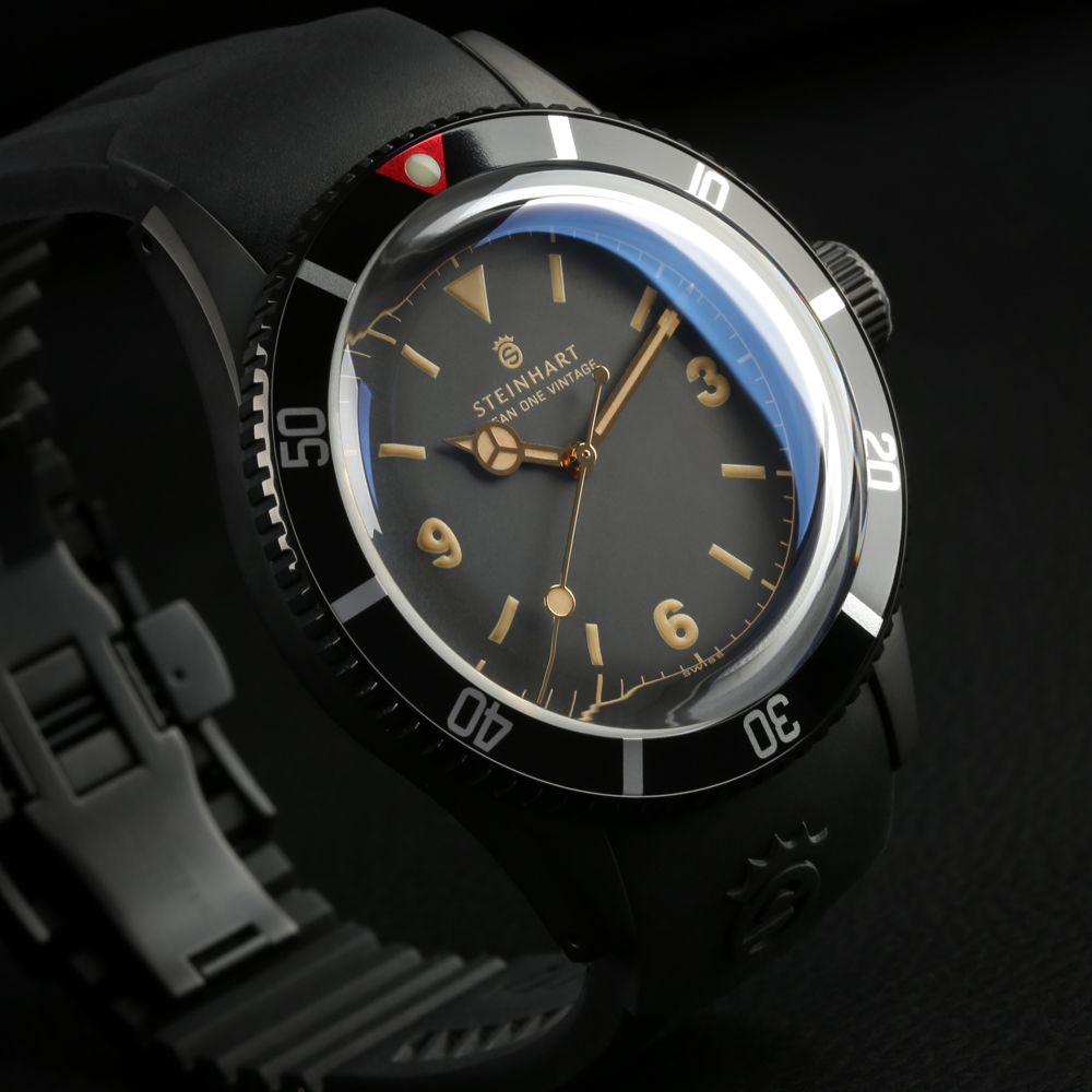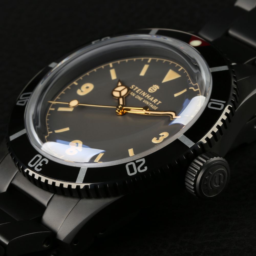 Im Gegensatz zu heute waren die ersten Taucheruhren sehr groß und boten dem Taucher, neben der Anzeige der Uhrzeit, keine weiteren Zusatzfunktionen. Erst in den frühen 1950er Jahren wurden die ersten Taucheruhren mit einer drehbaren Lünette entwickelt, die es dem Taucher ermöglicht, den Zeitraum seiner Tauchgänge sicher und genau zu überwachen. Dieser Ära, in der ein heute legendäres Sportuhren-Design geschaffen wurde, zollen wir mit der STEINHART Ocean One Vintage Black Edition unseren Tribut und verneigen uns vor den technischen Entwicklungen vergangener Zeiten. Aber das ist nicht das einzige Highlight dieser Taucheruhr im Retrodesign. Über die goldenen Zeiger und das dunkelgraue Zifferblatt mit Leuchtfarbe in “Old Radium” Optik wölbt sich ein gewaltiges, innen doppelt entspiegeltes Saphirglas, das umgehend an die Kunststoffgläser von Uhren vergangener Tage erinnert. Umrahmt wird dieses Bild mit der neuen, einseitig drehbaren Taucherlünette und dem beschichteten Edelstahl-Gehäuse, welches mit teilweise polierten, teilweise fein gebürsteten Oberflächen zu glänzen weiß. Als zusätzliches Highlight tickt im Inneren ein ETA 2824-2 Premium Werk, verziert mit einem eigens entwickelten schwarzen Rotor. Das passende Kautschukband packen wir Ihnen kostenlos mit dazu. Design von gestern gepaart mit Technik und Materialien von heute, so bietet die STEINHART Ocean One Vintage Black Edition ihrem Träger eine robuste Sportuhr für den täglichen Gebrauch mit einer Vintage-Optik, die ihn auch auf die Uhr schauen lässt, wenn er bereits weiß, wie spät es ist.