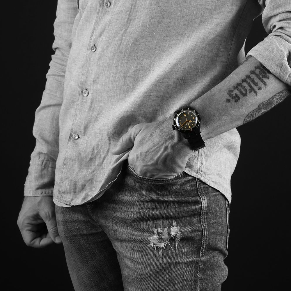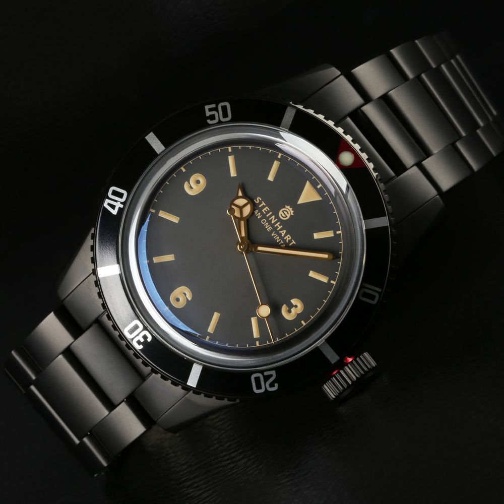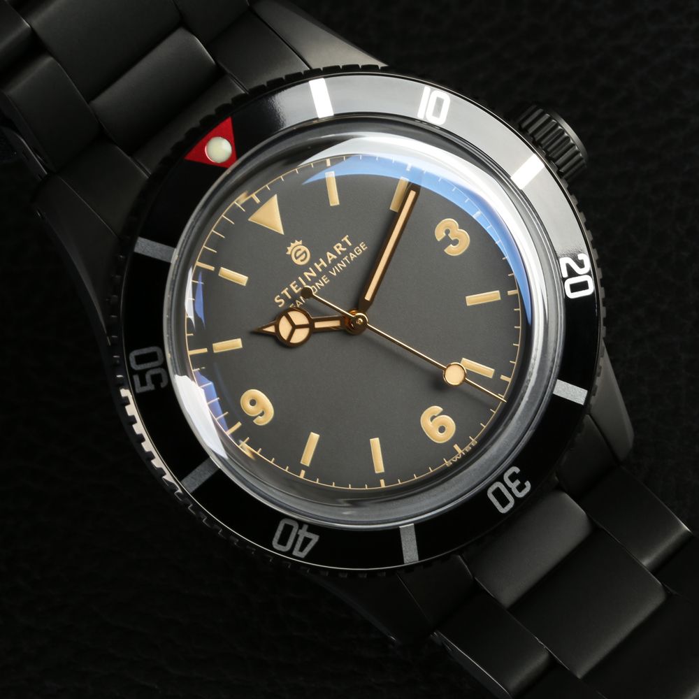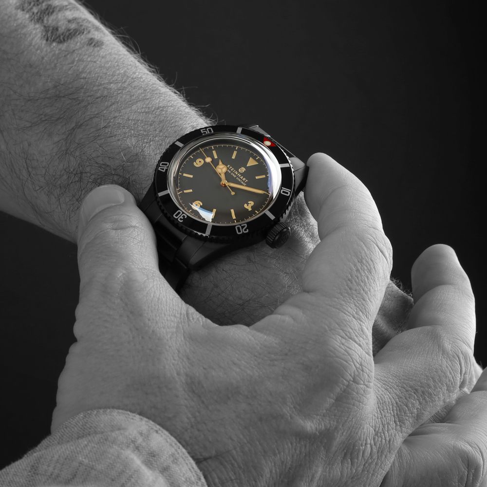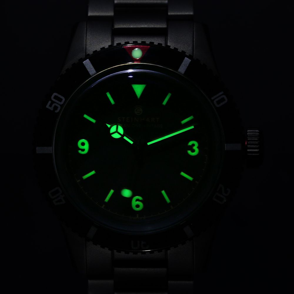 Im Gegensatz zu heute waren die ersten Taucheruhren sehr groß und boten dem Taucher, neben der Anzeige der Uhrzeit, keine weiteren Zusatzfunktionen. Erst in den frühen 1950er Jahren wurden die ersten Taucheruhren mit einer drehbaren Lünette entwickelt, die es dem Taucher ermöglicht, den Zeitraum seiner Tauchgänge sicher und genau zu überwachen. Dieser Ära, in der ein heute legendäres Sportuhren-Design geschaffen wurde, zollen wir mit der STEINHART Ocean One Vintage Black Edition unseren Tribut und verneigen uns vor den technischen Entwicklungen vergangener Zeiten. Aber das ist nicht das einzige Highlight dieser Taucheruhr im Retrodesign. Über die goldenen Zeiger und das dunkelgraue Zifferblatt mit Leuchtfarbe in “Old Radium” Optik wölbt sich ein gewaltiges, innen doppelt entspiegeltes Saphirglas, das umgehend an die Kunststoffgläser von Uhren vergangener Tage erinnert. Umrahmt wird dieses Bild mit der neuen, einseitig drehbaren Taucherlünette und dem beschichteten Edelstahl-Gehäuse, welches mit teilweise polierten, teilweise fein gebürsteten Oberflächen zu glänzen weiß. Als zusätzliches Highlight tickt im Inneren ein ETA 2824-2 Premium Werk, verziert mit einem eigens entwickelten schwarzen Rotor. Das passende Kautschukband packen wir Ihnen kostenlos mit dazu. Design von gestern gepaart mit Technik und Materialien von heute, so bietet die STEINHART Ocean One Vintage Black Edition ihrem Träger eine robuste Sportuhr für den täglichen Gebrauch mit einer Vintage-Optik, die ihn auch auf die Uhr schauen lässt, wenn er bereits weiß, wie spät es ist.
