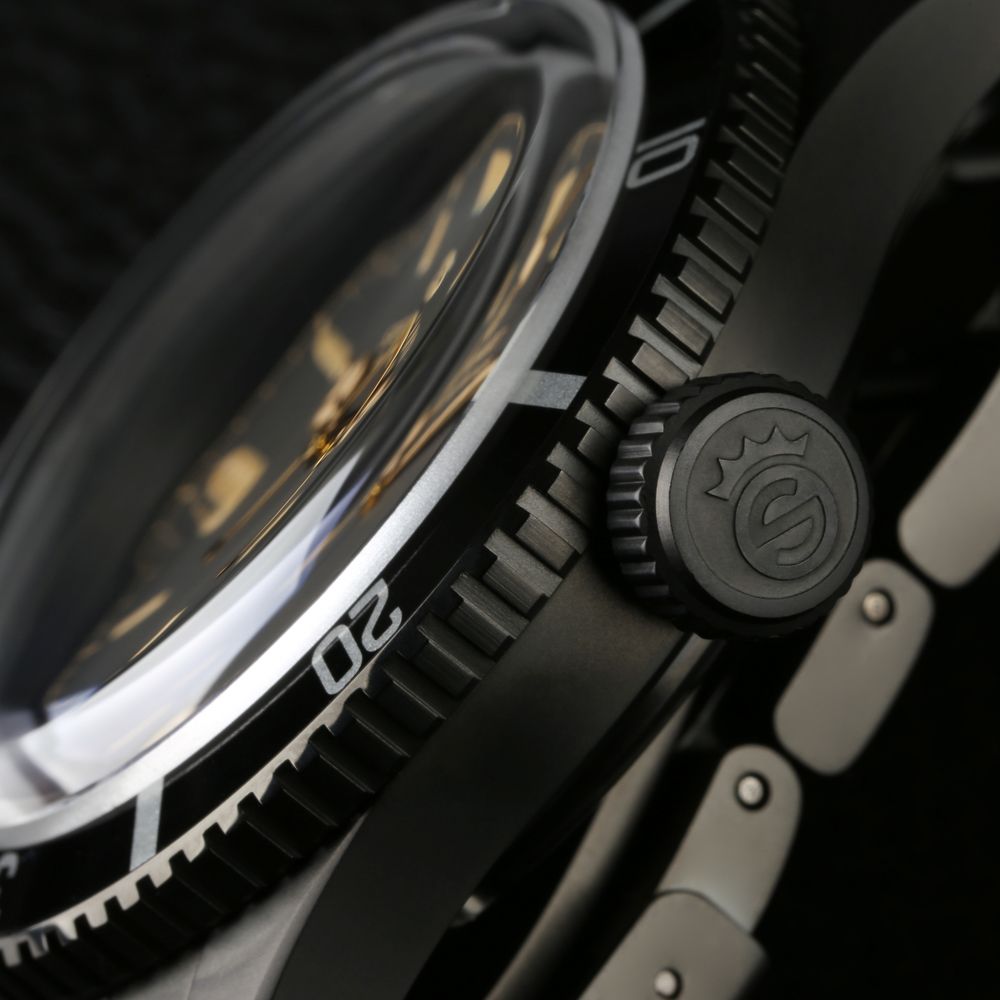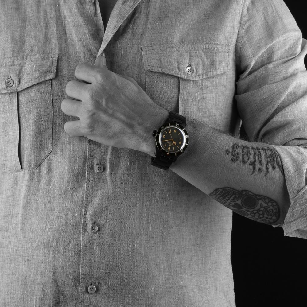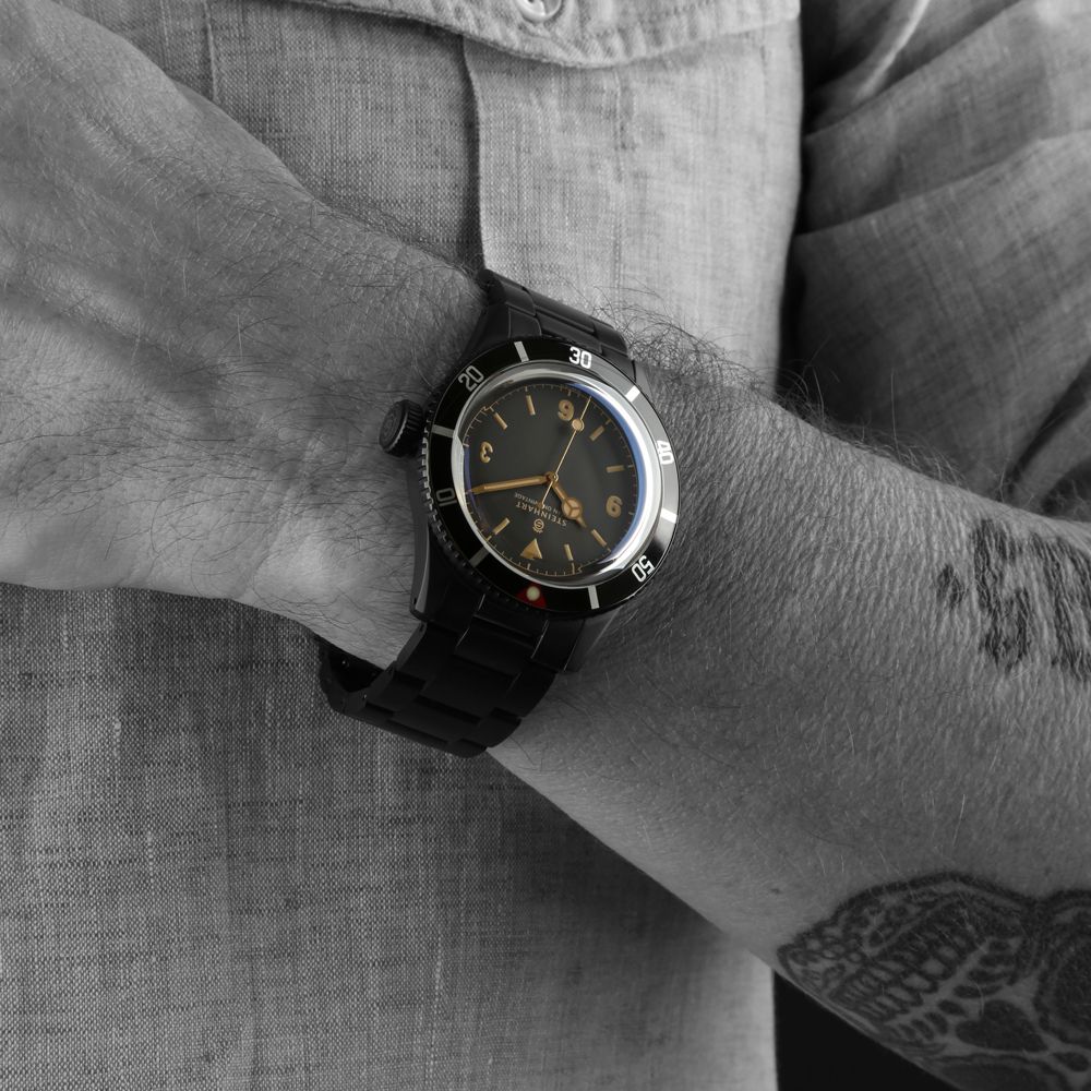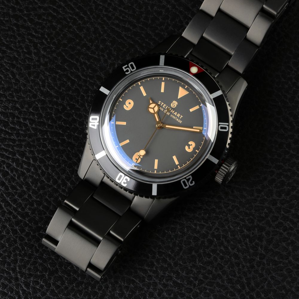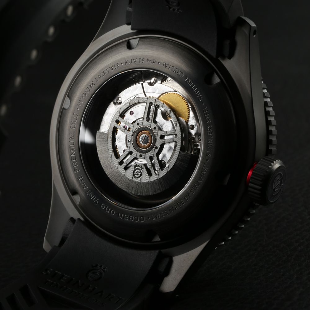 Im Gegensatz zu heute waren die ersten Taucheruhren sehr groß und boten dem Taucher, neben der Anzeige der Uhrzeit, keine weiteren Zusatzfunktionen. Erst in den frühen 1950er Jahren wurden die ersten Taucheruhren mit einer drehbaren Lünette entwickelt, die es dem Taucher ermöglicht, den Zeitraum seiner Tauchgänge sicher und genau zu überwachen. Dieser Ära, in der ein heute legendäres Sportuhren-Design geschaffen wurde, zollen wir mit der STEINHART Ocean One Vintage Black Edition unseren Tribut und verneigen uns vor den technischen Entwicklungen vergangener Zeiten. Aber das ist nicht das einzige Highlight dieser Taucheruhr im Retrodesign. Über die goldenen Zeiger und das dunkelgraue Zifferblatt mit Leuchtfarbe in “Old Radium” Optik wölbt sich ein gewaltiges, innen doppelt entspiegeltes Saphirglas, das umgehend an die Kunststoffgläser von Uhren vergangener Tage erinnert. Umrahmt wird dieses Bild mit der neuen, einseitig drehbaren Taucherlünette und dem beschichteten Edelstahl-Gehäuse, welches mit teilweise polierten, teilweise fein gebürsteten Oberflächen zu glänzen weiß. Als zusätzliches Highlight tickt im Inneren ein ETA 2824-2 Premium Werk, verziert mit einem eigens entwickelten schwarzen Rotor. Das passende Kautschukband packen wir Ihnen kostenlos mit dazu. Design von gestern gepaart mit Technik und Materialien von heute, so bietet die STEINHART Ocean One Vintage Black Edition ihrem Träger eine robuste Sportuhr für den täglichen Gebrauch mit einer Vintage-Optik, die ihn auch auf die Uhr schauen lässt, wenn er bereits weiß, wie spät es ist.