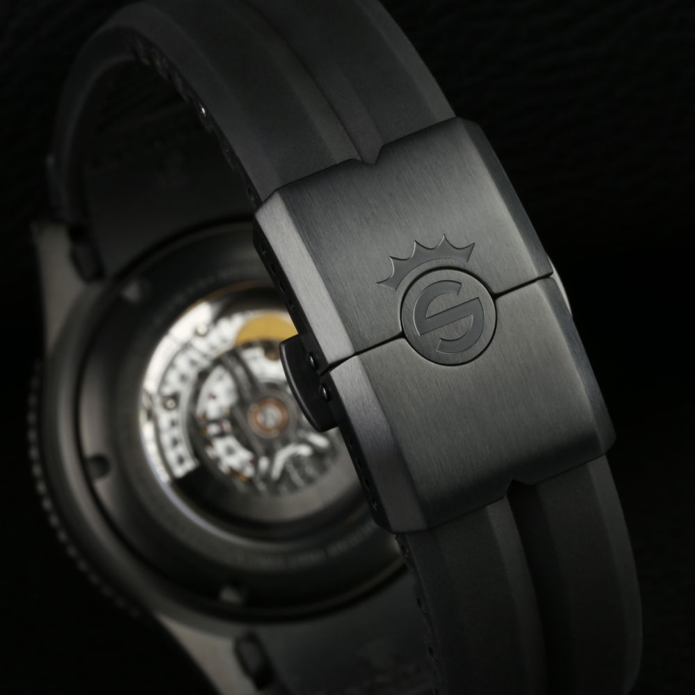 Rückseite: Edelstahl DLC matt, verschraubt mit Gravur, Saphirglasboden